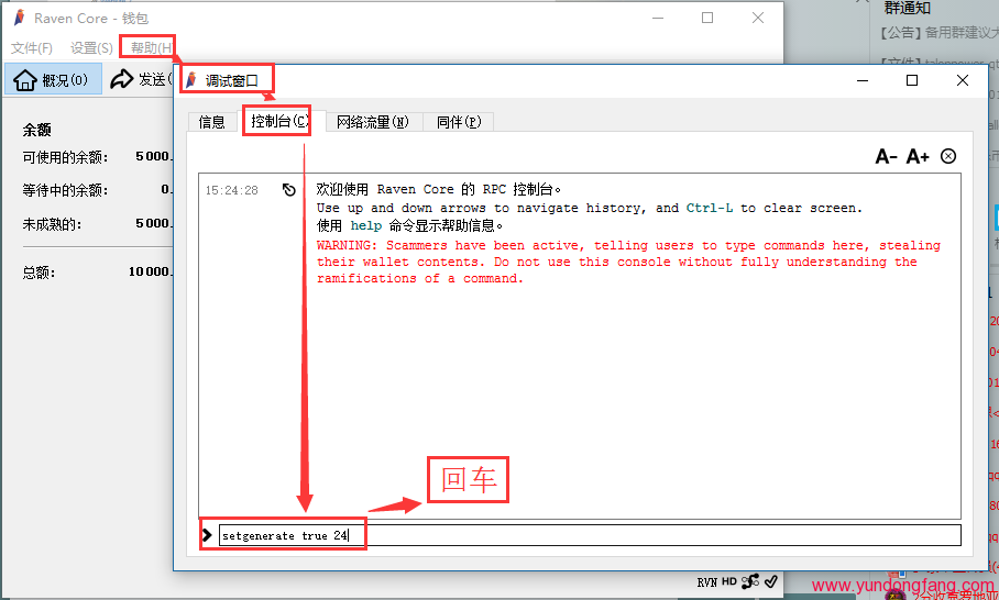 回车后发现电脑很卡说明在工作了,也可以通过任务管理器看CPU的使用性,一直很高说明在工作了。然后就不要管了。等着收币就好了。